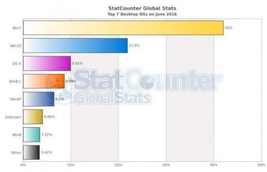 或許是免費(fèi)即將結(jié)束的原因,最近Win 10裝機(jī)量增長非常明顯。據(jù)市場調(diào)研公司StatCounter在7月初公布的數(shù)據(jù),截至今年6月Win 10市場份額達(dá)到了21.9%,環(huán)比增長5%。與此同時(shí),市場份額最大的Win 7卻處于下滑中。