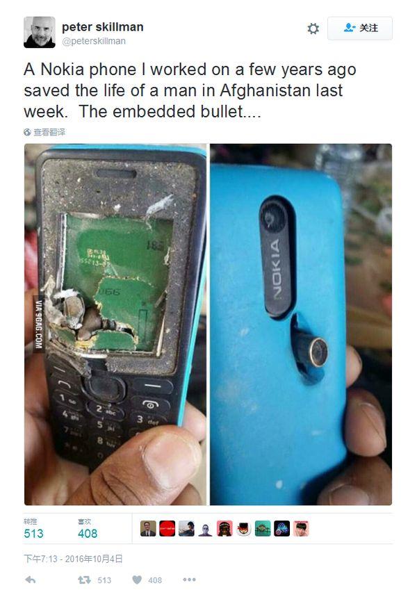 諾基亞擋子彈早已經(jīng)不是什么新鮮的事情了,近日它又成功挽救了一條鮮活的生命。微軟總經(jīng)理Peter Skillman在推文中寫(xiě)道“幾年前我參與研發(fā)的諾基亞手機(jī)上周在阿富汗救了一名男子的生命”,在被微軟收購(gòu)之前,Skillman是諾基亞的設(shè)計(jì)經(jīng)理。