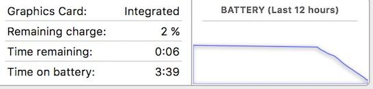 據(jù)外媒報道,近日,部分購買了配備Touch Bar的新款MacBook Pro的用戶表示,設(shè)備的續(xù)航時間比預(yù)期更短。尤其是一部分聲稱,他們的設(shè)備只能持續(xù)使用3到6個小時,跟當(dāng)初宣傳的10小時相比已大大縮水。一位叫做SRTM的MacRumors論壇網(wǎng)友表示,在充滿電之后,當(dāng)他用設(shè)備啟動一臺1080p的外置監(jiān)控器、偶爾在Chrome上瀏覽網(wǎng)頁時,設(shè)備只能堅持3個小時的時間,如果是玩游戲,那么時間將更短。