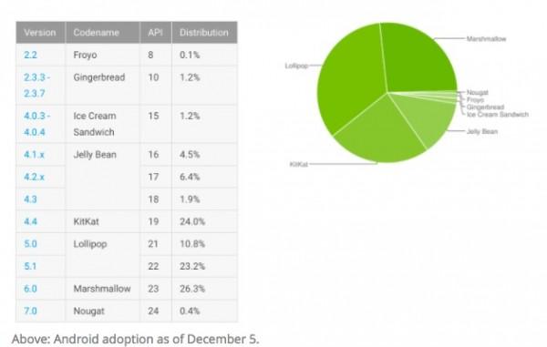 谷歌Android 7.0占有率低的可憐 僅有0.4%