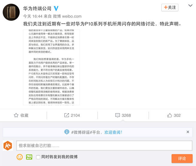 針對華為P10/P10 Plus閃存選用差異的熱門爭議話題,4月19日下午華為終端公司通過微博正式發(fā)表聲明,主要觀點是為保證千萬量級的供貨,核心元器件采用業(yè)界通用的辦法即多種解決方案供貨,不同解決方案在整體性能上都達到標準,能保持體驗的一致性,不存在歧視和欺騙消費者的情況。全文如下: