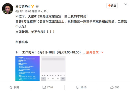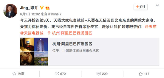 事實(shí)上天貓對京東的步步緊逼不僅是母嬰品類,此前天貓電器手機(jī)聯(lián)合品牌號稱讓利百億,天貓電器美家事業(yè)組總裁印井在微博中豪言同款大家電“貴就賠”,自己親自來做“首席補(bǔ)差官”;而天貓手機(jī)總經(jīng)理潘志勇更是賭上自己的年終獎,專門招聘10個臨時(shí)來比價(jià),日薪10000元,強(qiáng)調(diào)“天貓618就是比京東便宜”。
