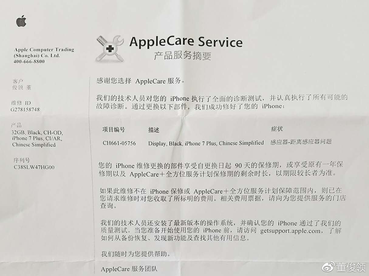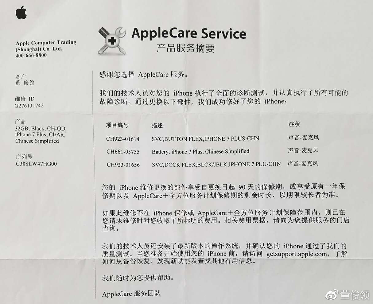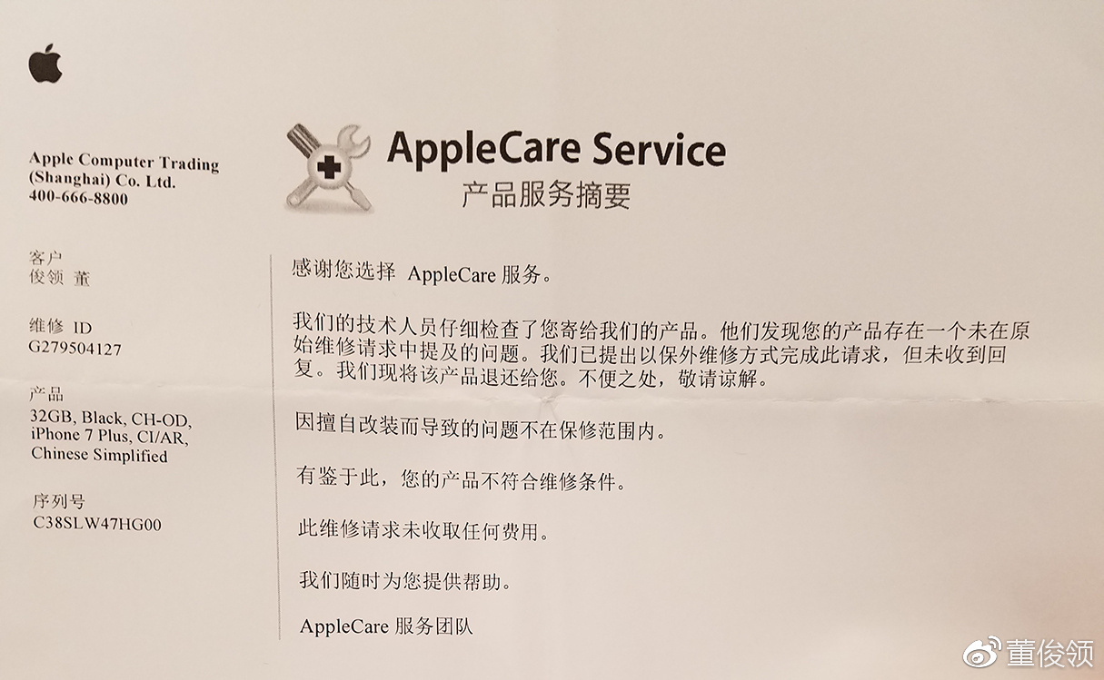 根據(jù)董俊領(lǐng)的說法,今年2月他在京東蘋果專營店購買了一臺iPhone 7 Plus 32G黑色手機(jī),使用過程中手機(jī)不斷出現(xiàn)問題,送到蘋果指定售后點(diǎn)寧波科泰電信維修數(shù)次后依然未徹底解決,隨后返廠得到蘋果反饋是無法給予官方維修,原因是“發(fā)現(xiàn)了原始維修記錄中沒有提及的問題,因擅自改裝不予保修”。寧波科泰電信堅稱硬件他們不會動的,都是申請返廠維修的,他們也不可能改裝,所以董俊領(lǐng)認(rèn)定京東銷售給自己的是翻新機(jī)。
