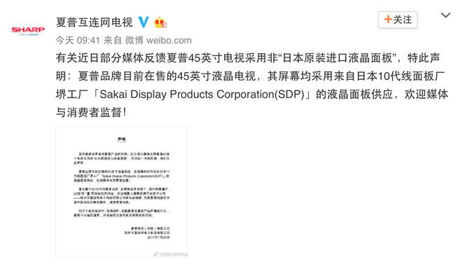 夏普電視辟謠:在售45寸電視均為日本液晶面板