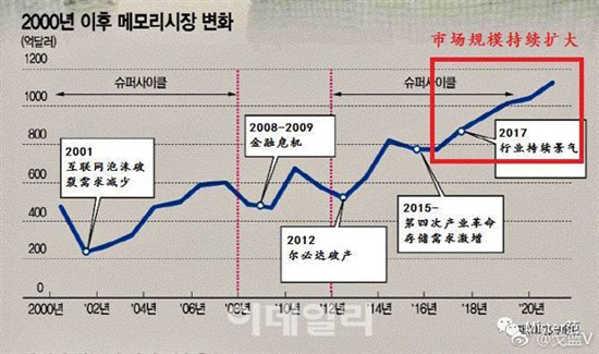 他引用了@帝都一只唐伯虎 的分析結(jié)論:存儲器產(chǎn)業(yè)和其他周期性產(chǎn)業(yè)一樣,隨著需求和產(chǎn)能的相互作用,會呈現(xiàn) “景氣——衰退——景氣” 的規(guī)律性循環(huán)(下圖)。2016年中期,這個景氣周期再次到來,而且來得比想象的更加兇猛(藍線代表市場規(guī)模的變化)。