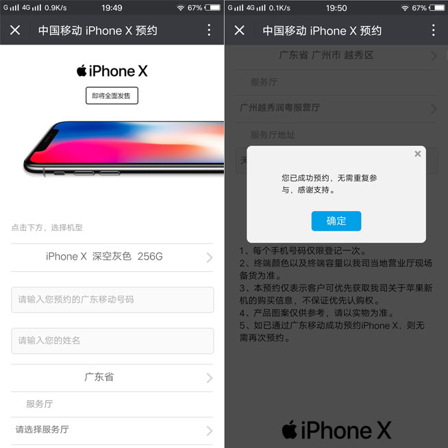 根據(jù)指尖俠的實測,通過中國移動預(yù)約iPhone X步驟較為簡單,目前蘋果官方提供的銀色/深空灰兩種顏色和兩種容量版本(64GB或256GB)均可以選擇,隨后輸入手機號碼、姓名、取機營業(yè)廳等信息即可。由于每個手機號碼僅限登記一次,建議大家謹慎填寫。不過要提醒各位的是預(yù)約成功并不代表就能輕松買到機器,中國移動官方也明確表示不保證優(yōu)先認購權(quán),此外終端顏色以及容量也是以當?shù)貭I業(yè)廳現(xiàn)場備貨為準。