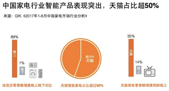 GFK監(jiān)測數(shù)據(jù)顯示,2017年1-8月,冰箱、洗衣機、空調(diào)等智能產(chǎn)品市場上,天貓智能家電占比超過50%,已成為引領(lǐng)家電行業(yè)結(jié)構(gòu)升級的第一平臺。天貓與品牌聯(lián)手孵化的Mini洗烘一體洗衣機、真空破壁機、超聲波沖牙器等新物種正成為一個個百億市場的新品類。