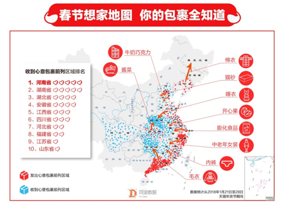 據(jù)阿里數(shù)據(jù)顯示,2018天貓年貨節(jié)期間,在廣東學習生活工作的異鄉(xiāng)人寄回故鄉(xiāng)的包裹最多,遙遙領先于排名二三的浙江省和北京市。這些裝著毛衣,棉服,芒果干的包裹被發(fā)往了他們的家鄉(xiāng)湖南,湖北,廣西壯族自治區(qū)等,小小的包裹承載了濃濃的思鄉(xiāng)情。