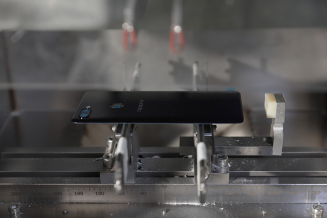而在QE實(shí)驗(yàn)室,則是對組裝好的手機(jī)進(jìn)行抽檢,如暴力跌落、扭曲測試、高溫、高濕、淋雨等一系列嚴(yán)苛的物理測試,乃至性能測試都是這里的常規(guī)項目,據(jù)悉抽檢的手機(jī)需經(jīng)過多達(dá)150余項測試后才能進(jìn)入量產(chǎn)。今年的R15由于采用了雙面玻璃設(shè)計,在OPPO的QE實(shí)驗(yàn)室內(nèi)還會故意將其玻璃砸裂,隨后再進(jìn)行各種物理抗壓測試,以確保手機(jī)即便在極限條件下也能保證用戶使用的安全。
