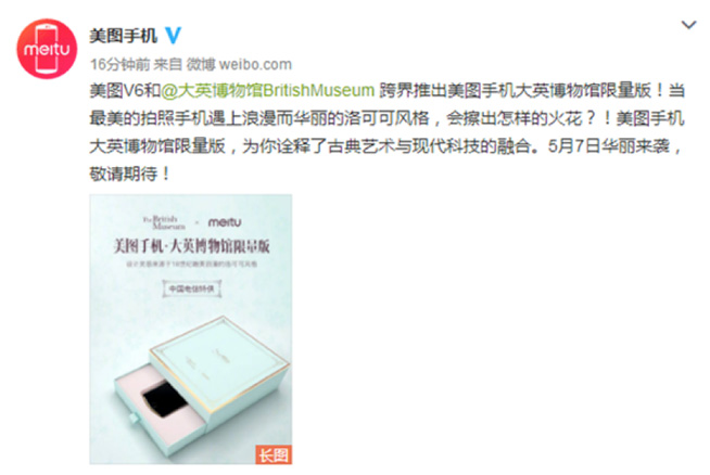 美圖官方公布將推出“美圖手機大英博物館限量版”,合作機型為美圖手機最新旗艦機型美圖V6。