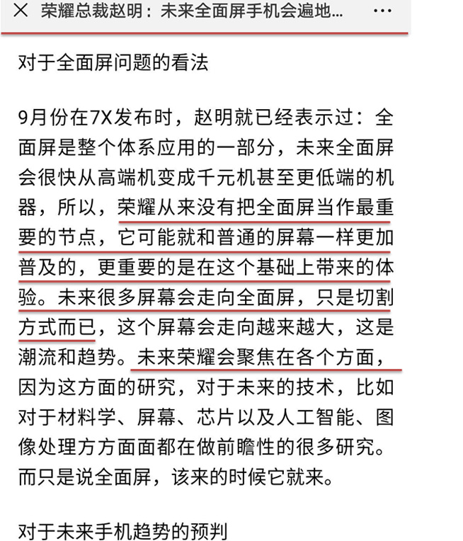 趙明表示:榮耀并沒有把全面屏當(dāng)一個特別重要的節(jié)點,我們也沒想到,這次亮相會像炸魚一樣炸出那么多友商。從趙明的話語中來看,雖然有一些調(diào)侃的意思,但卻也是事實。因為我們觀察到,其實在去年榮耀暢玩7X發(fā)布時,趙明就曾表示:“未來全面屏手機遍地都是”、“榮耀從來沒有把全面屏當(dāng)作最重要的節(jié)點,未來很多屏幕會走向全面屏,只是切割方式而已,更重要的是在這個基礎(chǔ)上帶來的體驗”、“未來榮耀會聚焦在各個方面”。