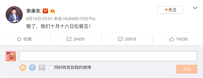 對于還有不到一個月就會在倫敦全球首發(fā)的華為Mate 20系列,近期華為消費(fèi)者業(yè)務(wù)CEO余承東在微博上頻頻傳達(dá)各種自信。