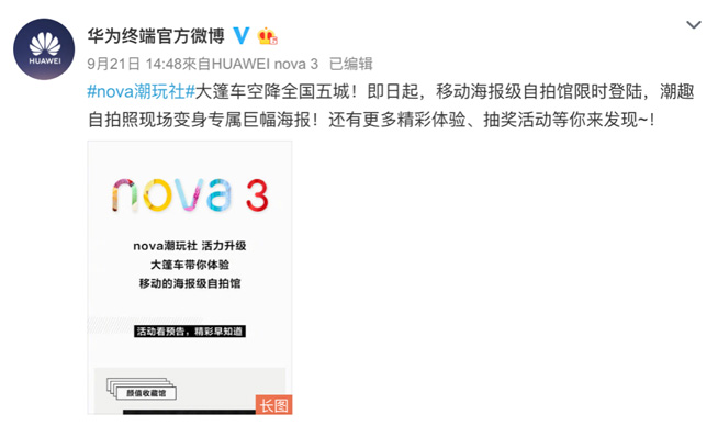 華為在全國五城開展了大篷車線下活動,讓消費(fèi)者零距離體驗華為nova3海報級自拍等炫酷功能。