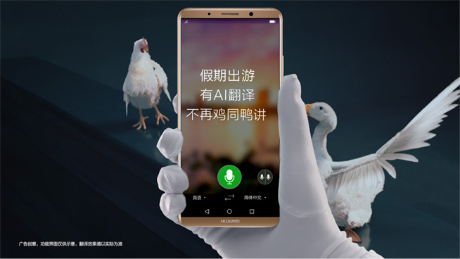近日,一段以“雞同鴨講”為主題的短視頻吸引了不少網(wǎng)友圍觀點(diǎn)贊。視頻講述了雞與鴨交流障礙的無奈以及意想不到的結(jié)局,而結(jié)尾出現(xiàn)的華為Mate 10手機(jī)配文“有AI翻譯,不再雞同鴨講”畫面毫無違和感,華為手機(jī)以過去不多見的幽默風(fēng)格宣傳產(chǎn)品,創(chuàng)意666。