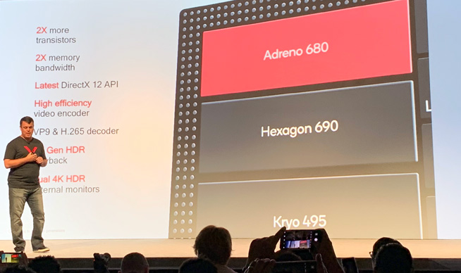 而在圖形處理部分,驍龍8cx配有的Adreno 680性能是驍龍850的2倍,更達到了驍龍835的3.5倍之多,短短一年多的時間便實現GPU性能的突破無疑讓人振奮。Adreno 680還擁有2倍內存帶寬,支持全新DirectX 12 API。