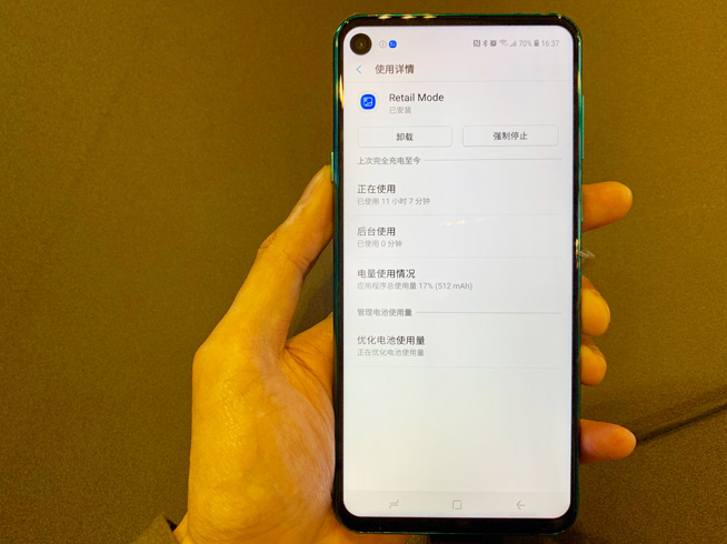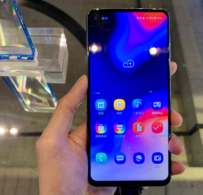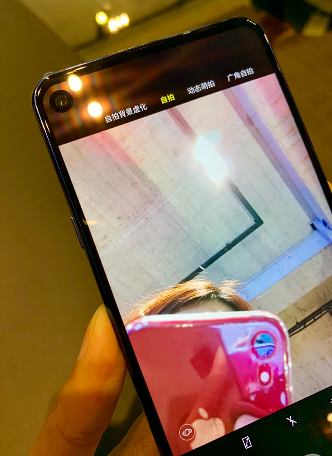 就科客君上手體驗(yàn)的三星Galaxy A8s真機(jī)來(lái)看,前置鏡頭放在屏幕左上頂角,由于屏幕物理開(kāi)孔的存在,手機(jī)的UI狀態(tài)欄有進(jìn)行專(zhuān)門(mén)的調(diào)整,當(dāng)然功能方面還是完整,前攝除了自拍用途之外還借此實(shí)現(xiàn)人臉識(shí)別解鎖功能。Galaxy A8s表面還是一塊完整的玻璃,在黑色顯示背景下其屏內(nèi)攝像頭并不會(huì)產(chǎn)生突兀感,效果就如iPhone劉海屏與黑色背景更配那樣,只不過(guò)在白色背景下這枚不大不小的前攝就有些許“搶鏡”了。