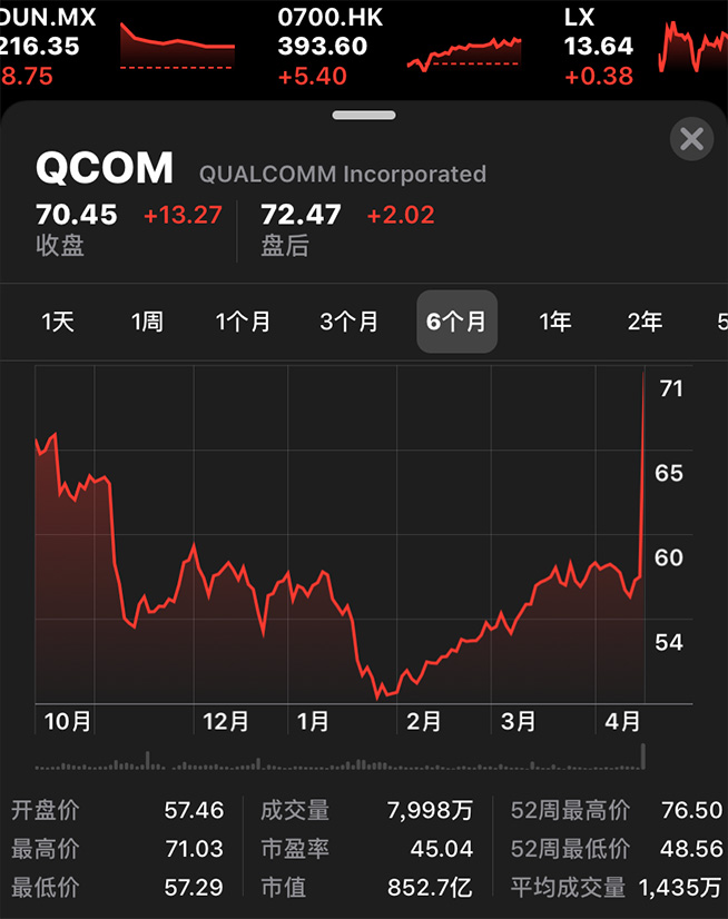 美國時間4月16日,美國蘋果公司在官方網(wǎng)站公布消息,稱高通和蘋果同意放棄此前正在進行的所有訴訟。根據(jù)協(xié)議,雙方結(jié)束了所有在全球范圍內(nèi)的訴訟糾紛,也即官宣和解。受此利好的刺激,高通股價當天猛漲23.21%,創(chuàng)下今年以來最高漲幅,且刷新了半年來的新高,蘋果方面則小漲0.01%。