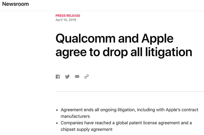 高通和蘋果同意放棄此前正在進行的所有訴訟。根據(jù)協(xié)議,雙方結(jié)束了所有在全球范圍內(nèi)的訴訟糾紛,也即官宣和解。