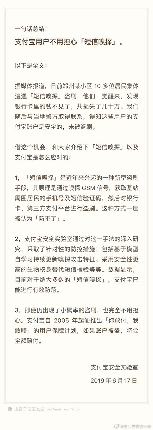 近日鄭州某小區(qū)10多位居民集體遭遇“短信嗅探”盜刷,銀行卡被盜了幾十萬。但隨后的調(diào)查發(fā)現(xiàn),他們的支付寶賬號(hào)分文未少。6月17日,支付寶安全實(shí)驗(yàn)室表示,隨著風(fēng)控系統(tǒng)的升級(jí),目前對(duì)于絕大多數(shù)此類攻擊,支付寶已能有效防范。