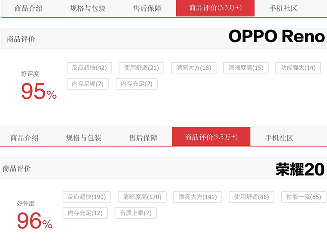 再看兩者的好評(píng)度,OPPO Reno的好評(píng)度為95%,而基數(shù)更大的榮耀20則為96%。經(jīng)過了更多人的考驗(yàn),得到的好評(píng)率還更高。這一數(shù)據(jù),則側(cè)面反映出榮耀20的產(chǎn)品力更強(qiáng),更符合消費(fèi)者的需求。