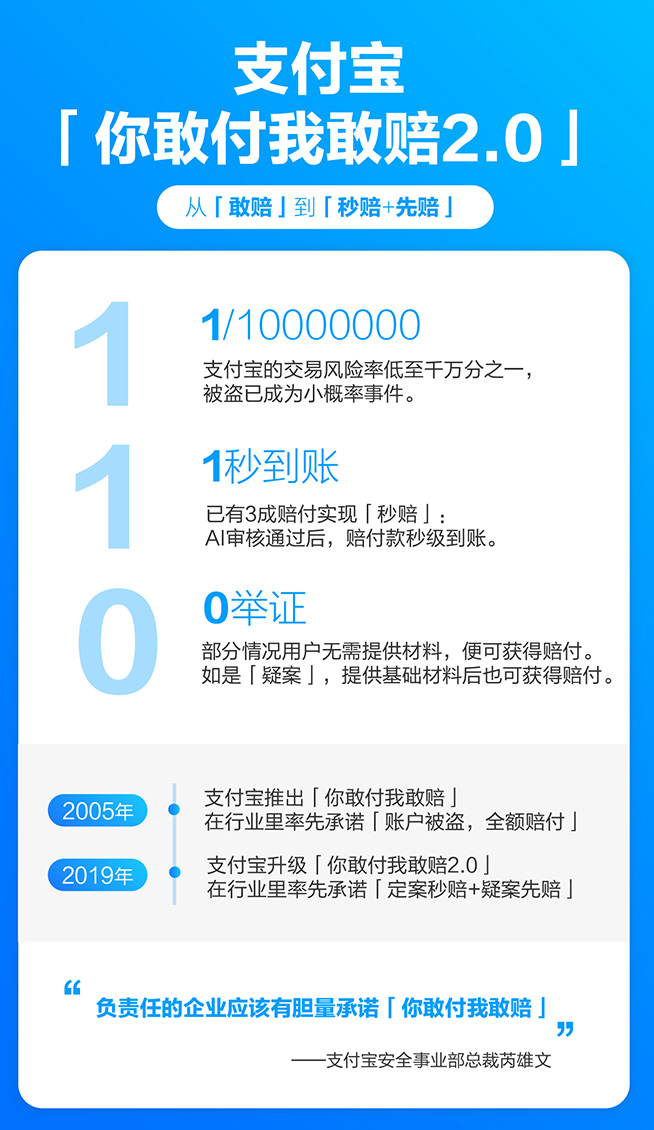 據(jù)悉,支付寶提供的“定案秒賠+疑案先賠”用戶保障,為業(yè)內(nèi)首創(chuàng),支付寶安全事業(yè)部總裁芮雄文認(rèn)為,“負(fù)責(zé)任的企業(yè)應(yīng)該有膽量承諾‘你敢付我敢賠’”。他還透露2005年支付寶提出這項(xiàng)承諾時“我們心里也沒有底”,但認(rèn)定優(yōu)先保障用戶權(quán)益是對的事就堅(jiān)持下來了,并且一做就是15年。