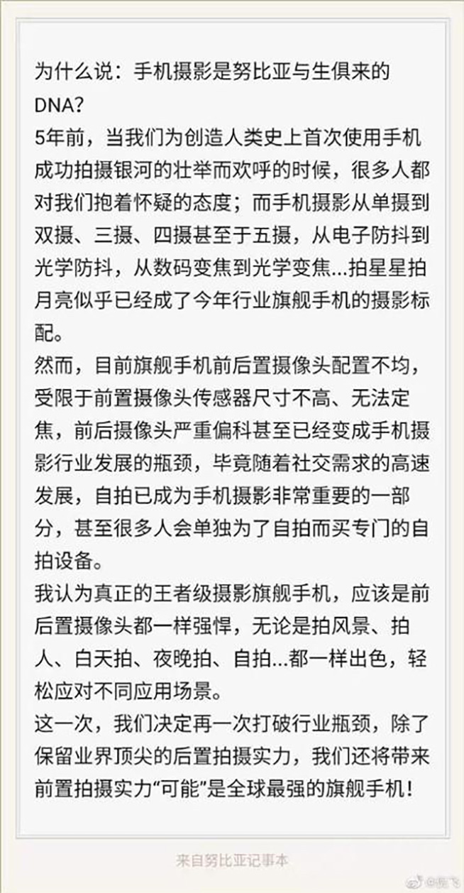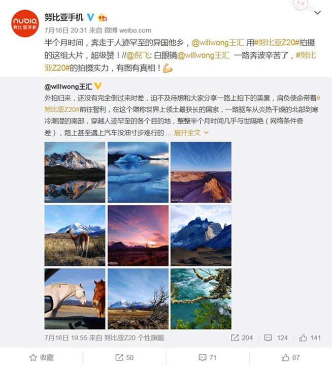 從目前來看,有關(guān)Z20的消息正在一點(diǎn)點(diǎn)的放出,但也僅限攝影方面。例如最早倪飛曾經(jīng)用一條長微博道破了目前旗艦機(jī)在自拍方面的短板、闡述了前置鏡頭與后置鏡頭的巨大差異,并暗示Z20極有可能做到前置鏡頭與后置鏡頭的均衡發(fā)展,言外之意就是自拍與攝影同樣強(qiáng)悍;隨后的事情更令人報(bào)以期待,中科院國家天文臺的鄧?yán)畈挪┦渴褂肸20在阿根廷拍攝了今年南半球唯一一次日全食,食既、食甚、生光這三個重要時刻都被清晰定格;而知名攝影發(fā)燒友@willwong還使用Z20拍攝了智利風(fēng)景大片,南美洲的絕美景色在照片中展現(xiàn)的淋漓盡致,扎實(shí)的色彩、飽滿的細(xì)節(jié)甚至讓人無法相信這竟是一部手機(jī)的杰作。