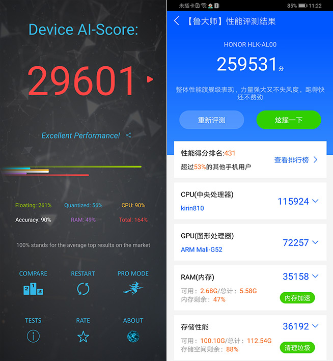 AI部分,麒麟810采用自主達(dá)芬奇架構(gòu)NPU,AI算力表現(xiàn)如何呢?從AI Benchmark跑分來看,榮耀9X能達(dá)到接近30000的高分。而由跑分軟件魯大師的性能測試結(jié)論可知,榮耀9X“整體性能旗艦級表現(xiàn)”,我們測試時跑出的27萬多分超過了61%的其他手機用戶。值得一提的還有,性能測試過程中榮耀9X只有攝像頭附近有輕微發(fā)熱,電池溫度則僅升高至36攝氏度(平時為30攝氏度左右),內(nèi)部散熱處理相當(dāng)給力。