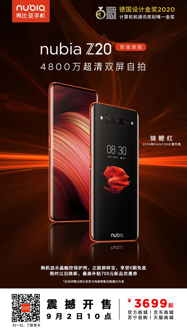 這么漂亮的努比亞Z20 錦鯉紅配色將于9月2日上午十點(diǎn),在努比亞官網(wǎng)、努比亞京東官方旗艦店、努比亞天貓官方旗艦店、努比亞蘇寧官方旗艦店正式開售。售價(jià)方面也是誠(chéng)意滿滿,其8GB+128GB版售價(jià)3699元、8GB+512GB版售價(jià)4199元。