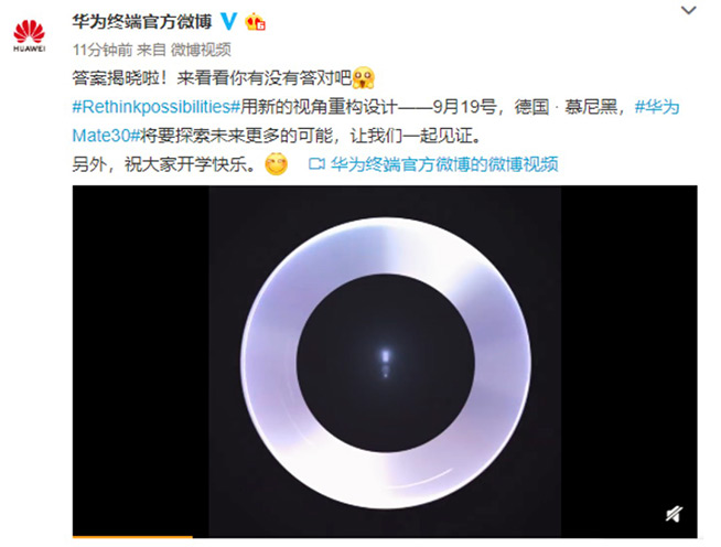 9月1日,華為終端官方微博發(fā)布了一支疑似新一代旗艦手機(jī)的預(yù)熱視頻,配以文案:“答案揭曉啦!來(lái)看看你有沒(méi)有答對(duì)吧[憧憬] #Rethinkpossibilities#用新的視角重構(gòu)設(shè)計(jì)——9月19號(hào),德國(guó) · 慕尼黑,#華為Mate30#將要探索未來(lái)更多的可能,讓我們一起見(jiàn)證。”。