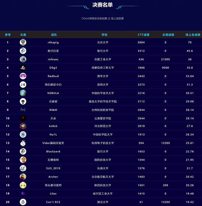 8月12日至8月25日,OGeek網(wǎng)絡(luò)安全挑戰(zhàn)賽展開了兩輪激烈的線上選拔,分別是“OGeek線上選拔賽之安全眾測”和“OGeek線上選拔賽之CTF奪旗”。最終,來自北京大學(xué)、江蘇科技大學(xué)、深圳大學(xué)的聯(lián)合戰(zhàn)隊“r4kapig”戰(zhàn)隊以5084分的CTF高分拔得頭籌,“復(fù)旦白澤”戰(zhàn)隊和“infosec”戰(zhàn)隊緊隨其后,與其他共計20支戰(zhàn)隊突出重圍,殺入決賽。