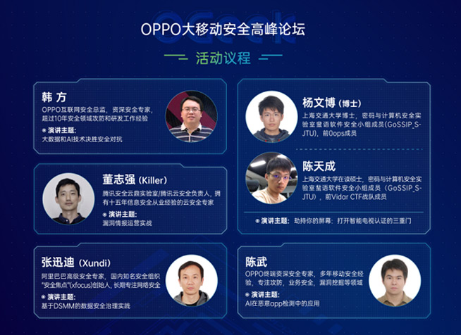 9月21日當(dāng)天,OPPO還將舉辦一場主題為“大移動安全”的高峰論壇,邀請了來自騰訊、阿里巴巴、上海交大等數(shù)位資深專家圍繞“大移動安全”進(jìn)行主題分享。值得期待的是,屆時OPPO資深安全專家韓方、陳武,江湖人稱安焦教父的安全焦點創(chuàng)始人張迅迪與核心成員killer也將來到現(xiàn)場。此外,OPPO還邀請了來自上海交通大學(xué)loccs實驗室蜚語軟件安全小組的楊文博、陳天成等年輕一代優(yōu)秀科研人員代表展開分享,真可謂大咖云集。同時,峰會現(xiàn)場還邀請了國內(nèi)12家高科技企業(yè)安全應(yīng)急響應(yīng)中心設(shè)立活動展臺,為參會者和年輕網(wǎng)絡(luò)安全人才提供寶貴交流機會。