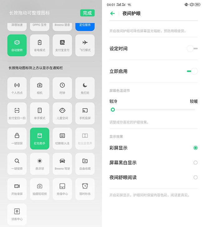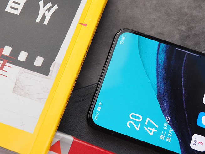 由于機身內(nèi)部塞入了數(shù)量更多的攝像頭,且電池容量提升至4000mAh,Reno 2機身略有拉長,屏幕尺寸增加至6.5英寸,覆蓋有康寧大猩猩第六代玻璃,屏幕分辨率調(diào)整為20:9比例的2400*1080像素。但更值得關(guān)注的是,Reno 2的顯示屏獲得了德國萊茵TüV全局護眼認證,為全球首款獲得此殊榮的手機。另外憑借新發(fā)光材料的運用,Reno 2屏幕亮度達到500尼特(典型值),若在陽光下還能達到700尼特。事實上在室內(nèi)將Reno 2與Reno的屏幕均調(diào)至最高亮度,光暗差距已經(jīng)是肉眼可見(Reno屏幕亮度典型值為430尼特),且細看還會發(fā)現(xiàn)Reno 2的顯示通透性更佳。