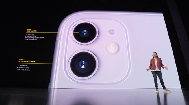 不出所料,iPhone 11的背面雙攝結(jié)構(gòu)設(shè)計大改,以容納下更大尺寸的攝像頭。背面自上而下,分別是1200萬像素廣角主攝和1200萬像素超廣角鏡頭,主攝為26mm焦段f/1.8光圈,6片式鏡片,超廣角鏡頭則是5片式鏡片,13mm焦段f/2.4光圈,提供高達120度的廣角視野。