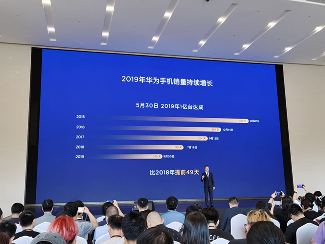 今年5月30日,華為手機的年度出貨量便已經(jīng)突破1億臺,比2018年提前49天。
