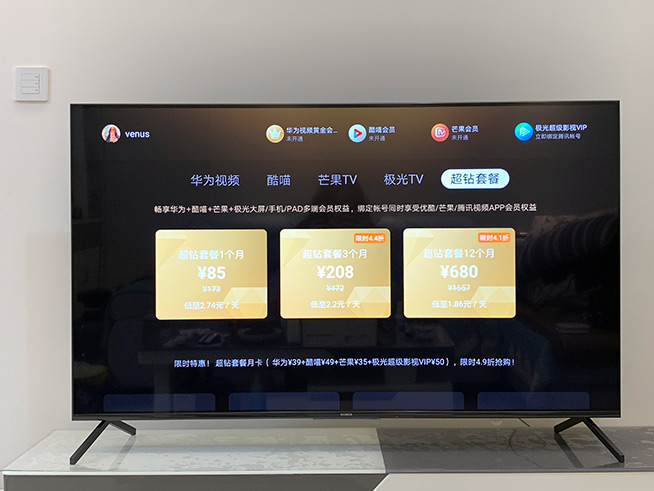 當(dāng)然,要看不同平臺(tái)的VIP視頻以及跳過片頭片尾的廣告,你還需購買相應(yīng)平臺(tái)的會(huì)員。榮耀智慧屏PRO購機(jī)即送四大平臺(tái)一個(gè)月的免費(fèi)會(huì)員,此外還提供了續(xù)費(fèi)組合優(yōu)惠以及四大平臺(tái)會(huì)員打包優(yōu)惠價(jià)(10月底為680元/年),僅為原價(jià)的一半不到,對于重度視頻用戶來說是個(gè)蠻不錯(cuò)的選項(xiàng)。