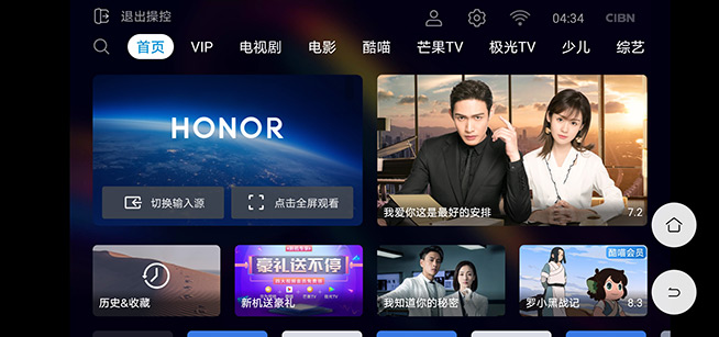 榮耀智慧屏PRO整合有華為視頻、極光云視聽、芒果TV、酷喵四大視頻平臺(tái)的資源,主界面上可方便切換至相應(yīng)視頻平臺(tái)的專屬內(nèi)容頁,也就是說用戶不需要單獨(dú)安裝打開相應(yīng)的App,省去了載入打開以及看開屏廣告的時(shí)間,體驗(yàn)更加無縫。