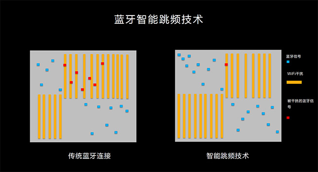 常用無線耳機(jī)聽音樂的朋友會(huì)知道,在大型車站或者人多的商圈,無線聽歌容易出現(xiàn)斷斷續(xù)續(xù)或卡頓的干擾問題,且市面上大部分產(chǎn)品都有這樣的通病。對(duì)此華為FreeBuds 3引入了藍(lán)牙智能跳頻技術(shù),原理是在發(fā)射端和接收端檢測(cè)到指定幅度的干擾時(shí),迅速切換到下一個(gè)信道,實(shí)現(xiàn)更佳的穩(wěn)定性體驗(yàn)。