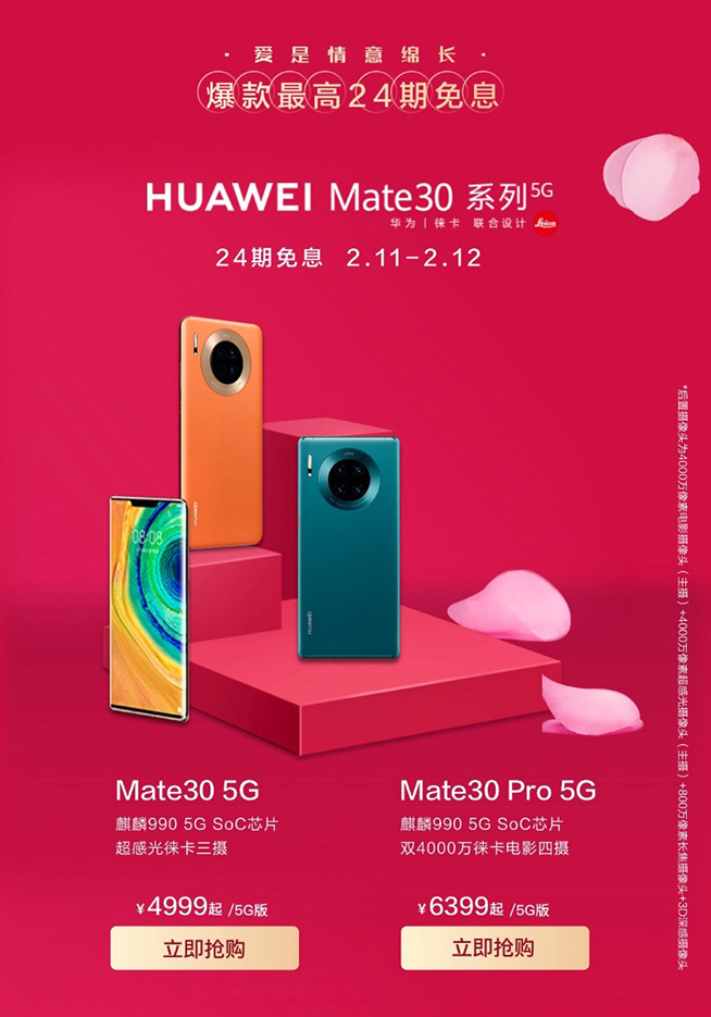 從2月11日開(kāi)始至2月12日,在華為官方商城以及天貓、京東等電商平臺(tái)選購(gòu)華為Mate30系列5G版,可以享受24期免息的優(yōu)惠。