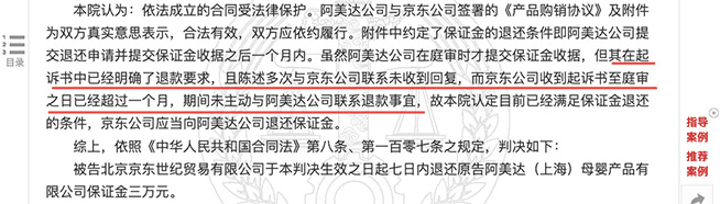 最終,在2019年11月11日這天,法院判決京東公司在判決生效之日起7個工作日內(nèi)返還3萬元保證金。