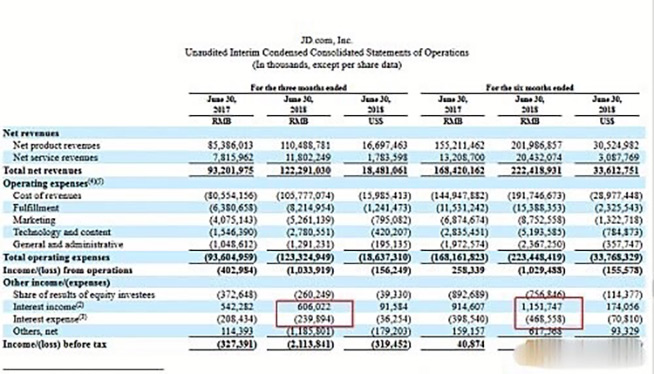 (京東2018年二季度財報顯示,其凈利潤主要來自于利息收入)