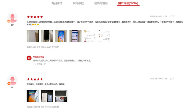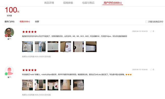 在華為商城,華為P40 Pro更是獲得了100%的好評度,不少用戶留言是華為手機的老客戶,而對P40 Pro真機的拍照、顏值、屏幕效果更是贊賞有加。
