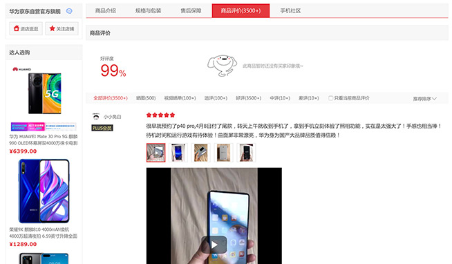京東商城華為京東自營旗艦店則顯示,華為P40 Pro的好評度達到99%,有網(wǎng)友收到手機后立刻體驗了相機,評價“實在是太強大了”,另外“手感也相當(dāng)棒”。另外,有第一次用華為手機的用戶給出了“震撼”的好評。