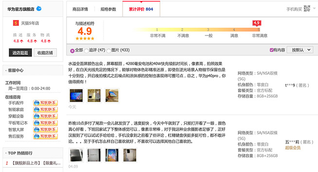 由天貓華為官方旗艦店的銷量數(shù)據(jù)可知,當(dāng)前選擇P40 Pro的用戶比P40更多,P40 Pro在天貓的客戶評價達到4.9分(滿分5分),大多數(shù)消費者評價還是非常滿意。