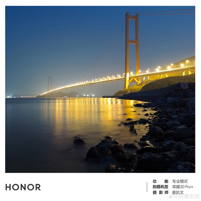 除了長焦樣張之外,4月13日榮耀老熊還發(fā)布了一張用榮耀30 Pro+專業(yè)模式拍攝的暗拍樣張。從這張由晚上19:00光線最復(fù)雜情況下拍攝的舟山西堠門大橋的樣張來看,筆者發(fā)現(xiàn),榮耀30系列在畫面的高光抑制、噪點(diǎn)處理以及暗部細(xì)節(jié)的處理等方面都有不凡表現(xiàn)。