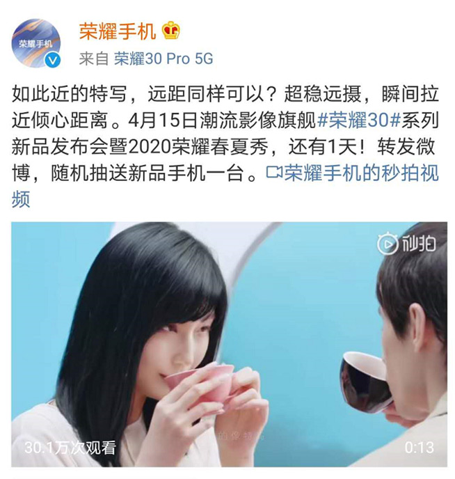 根據(jù)榮耀官方微博發(fā)布的變焦視頻,男女主之間雖然隔著超級長桌,但在榮耀30系列的輔助下,瞬間拉近兩人的距離;從人物特寫來看,畫面質(zhì)量極高,色彩飽滿,清晰細(xì)膩。