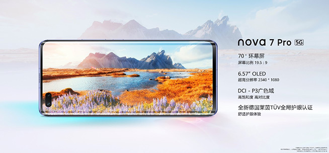 屏幕方面,nova7全系OLED屏幕,通過全新德國萊茵TüV全局護眼認證,視覺效果更佳。nova7 Pro采用6.57英寸19.5:9 FHD+曲面屏,70°曲率,視覺觀感更高級,視野更開闊,前后雙曲面機身設計,握持體驗更舒適。