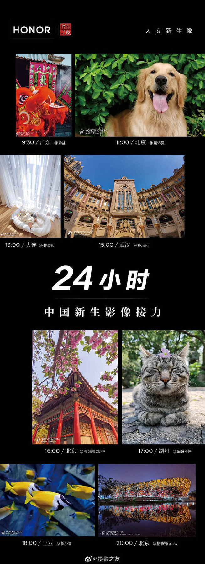 8名攝影師用24小時接力的新穎方式,用全新上市的榮耀30系列手機記錄下新生后幾大城市的美貌與活力。