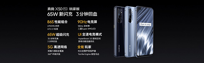 同時,作為本次發(fā)布會的重頭戲、realme進入中國市場一周年的獻禮,真我X50 Pro玩家版正式發(fā)布。作為專為真粉玩家打造的性能旗艦,真我X50 Pro 玩家版擁有充滿速度感和科技感的全新設計,配色上具有“光速銀”和“幻影黑”;搭載高通驍龍865和LPDDR 5,并首次搭載UFS 3.1,三者組成“性能黃金組合”,具有目前5G旗艦性能的最高水準。