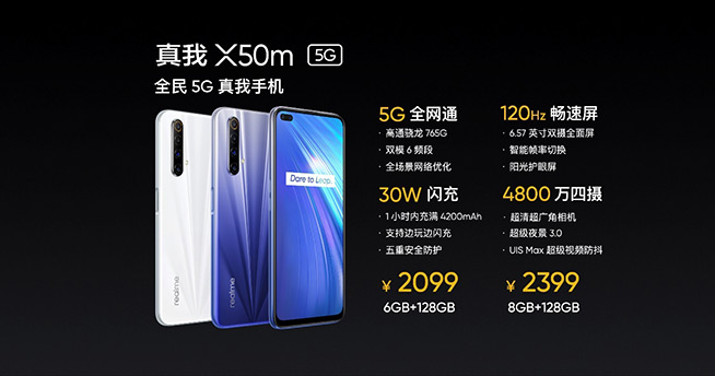 “5G全民手機”realme 真我X50m也同步亮相,產(chǎn)品顏值超高,具有“星空”藍、“銀河”白兩款全新設計,支持雙模6頻段5G網(wǎng)絡、搭載驍龍765G、120Hz暢速屏、30W Dart閃充和前后6攝影像系統(tǒng),將成為入門5G手機的新首選。