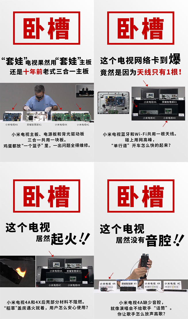 根據(jù)拆機結(jié)論,在相同價位檔的前提下,榮耀智慧屏X1擁有過硬的品質(zhì)和領(lǐng)先的工藝,三款小米電視(4A/4C/4X)則存在3大體驗缺失、6大偷工減料以及1大安全隱患,結(jié)合橫向的感知對比,小米電視體驗明顯遜色。?
